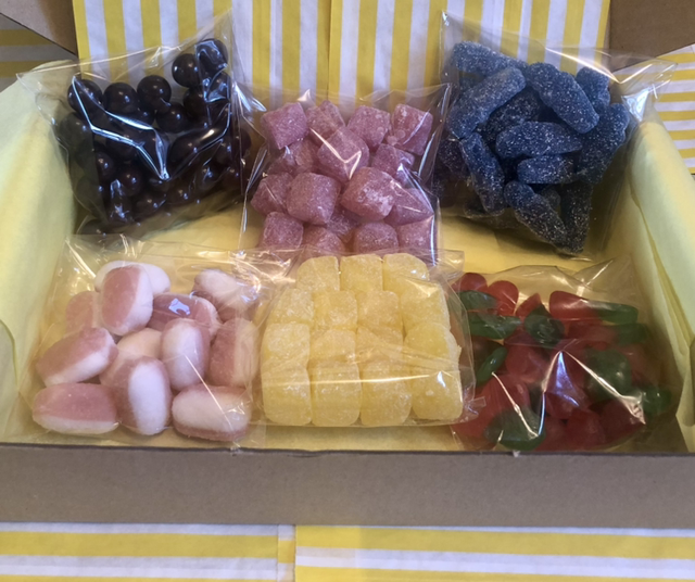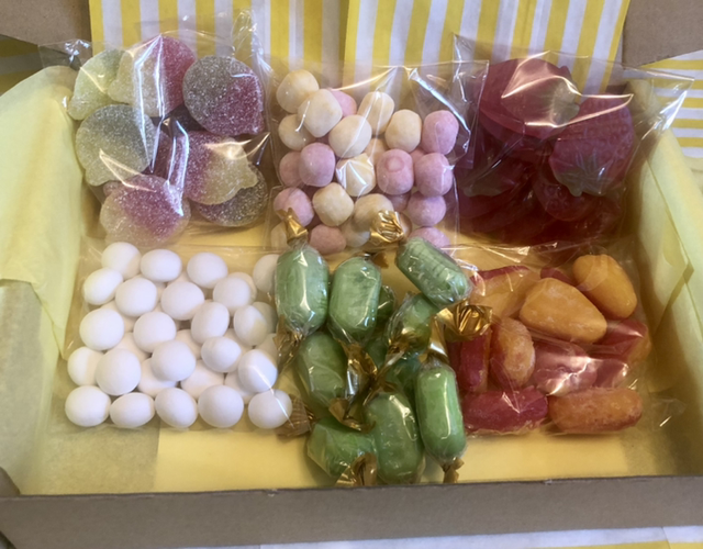 Create Your Own’ Sweet Gift Box. 6 flavours of sweets, 100g each. Beautifully decorated. Sweets come wrapped in seasonal paper candy bags, (currently Spring Yellow), plus confetti & ribbon. Ingredients & best before dates included. Message us your 6 choices of delicious sweets, from over 20 flavours in our vegan and vegetarian ranges. Email: thesugargarden22@gmail.com Plus let us know your message for the recipient, if choosing ‘add a gift card & gift tag’